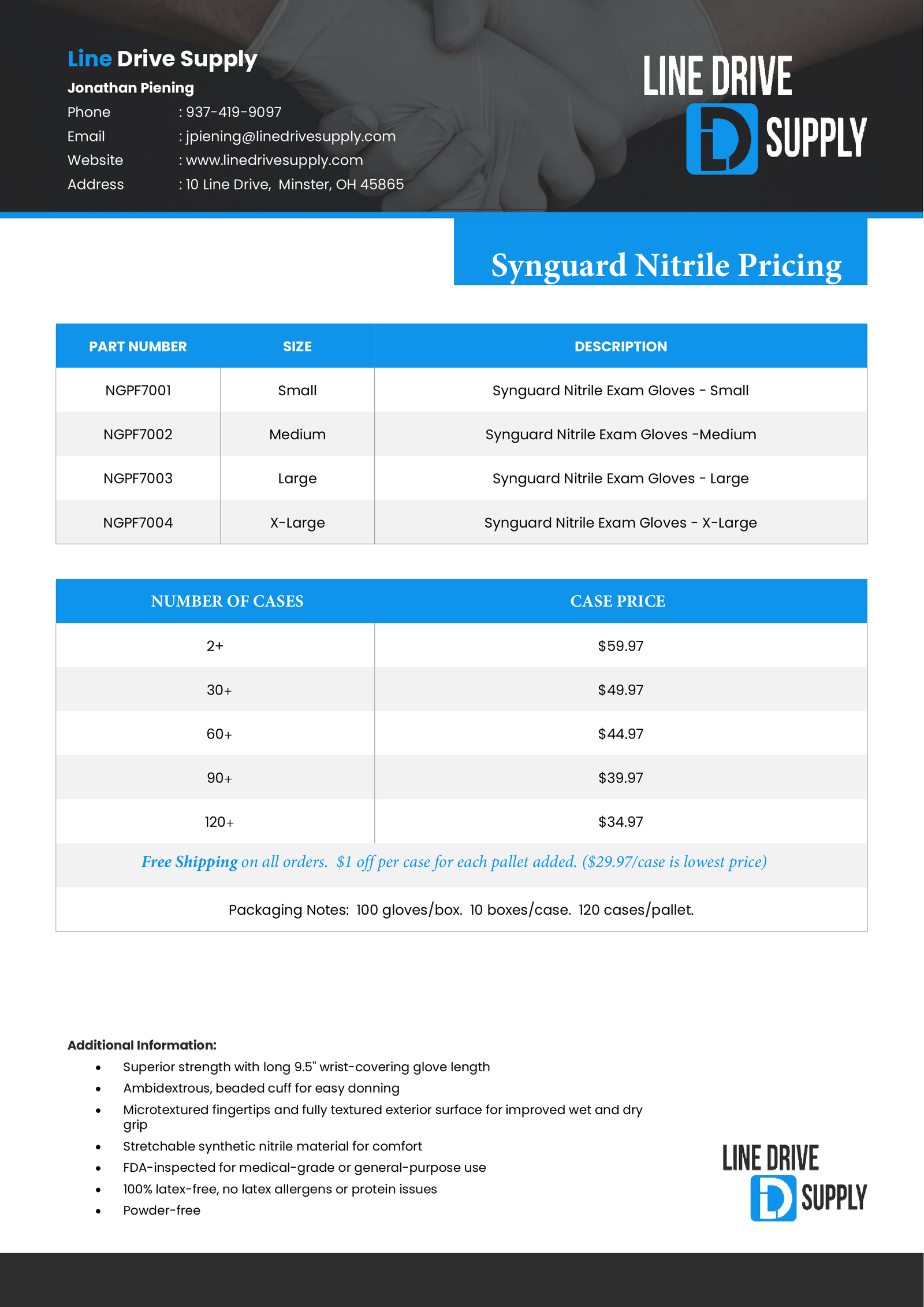 - 100 gloves/box, 10 boxes/case, 120 cases per pallet.
